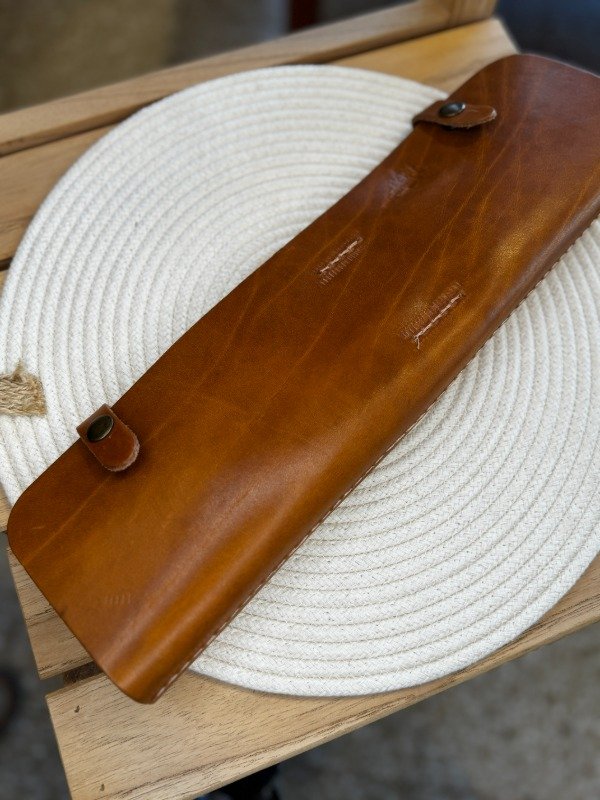 Set parrillero con cuchilla grande, tenedor, chaira y cuchilla chica, con cabo de madera y aplique de bronce.